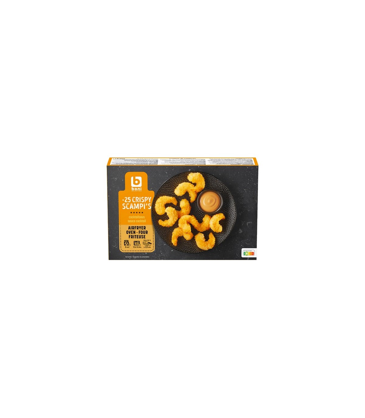 Savourez ces délicieux scampis enrobés d’une panure croustillante, prêts à être dégustés en quelques minutes. Accompagnés d'une sauce savoureuse, ils constituent une entrée ou un apéritif idéal pour toute la famille. Mode de préparation : adaptés à la cuisson au four, à l’airfryer ou à la friteuse, pour un résultat toujours croustillant. Un produit pratique et gourmand, à toujours avoir sous la main pour les moments festifs ou les repas rapides. Chaque boite contient 25 pièces pour 500 gr.