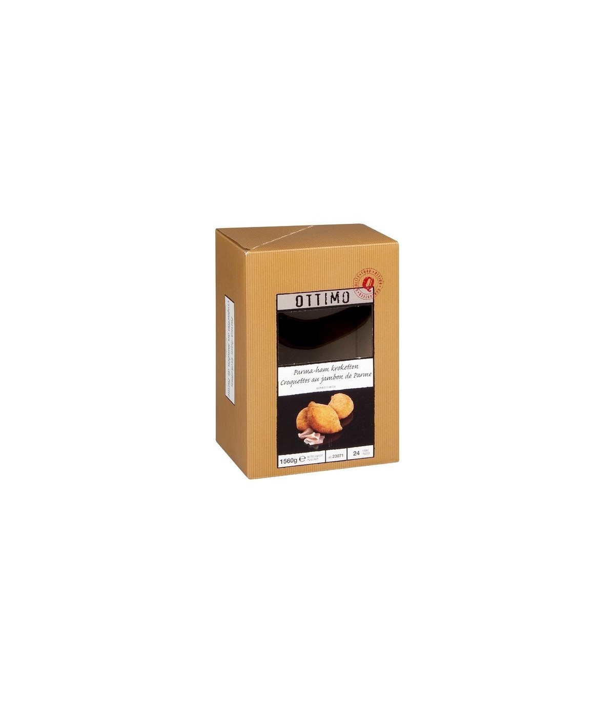 Ottimo croquettes au jambon Serrano sont de délicieuses croquettes remplies d'une onctueuse farce délicate au jambon Serrano enveloppée d'une robe légèrement craquante. Idéal pour la préparation de vos entrées ou en plat principal. Cuisson: à la friteuse: 4-5 min à 180°C. Chaque paquet contient 24 croquettes de 65 gr.