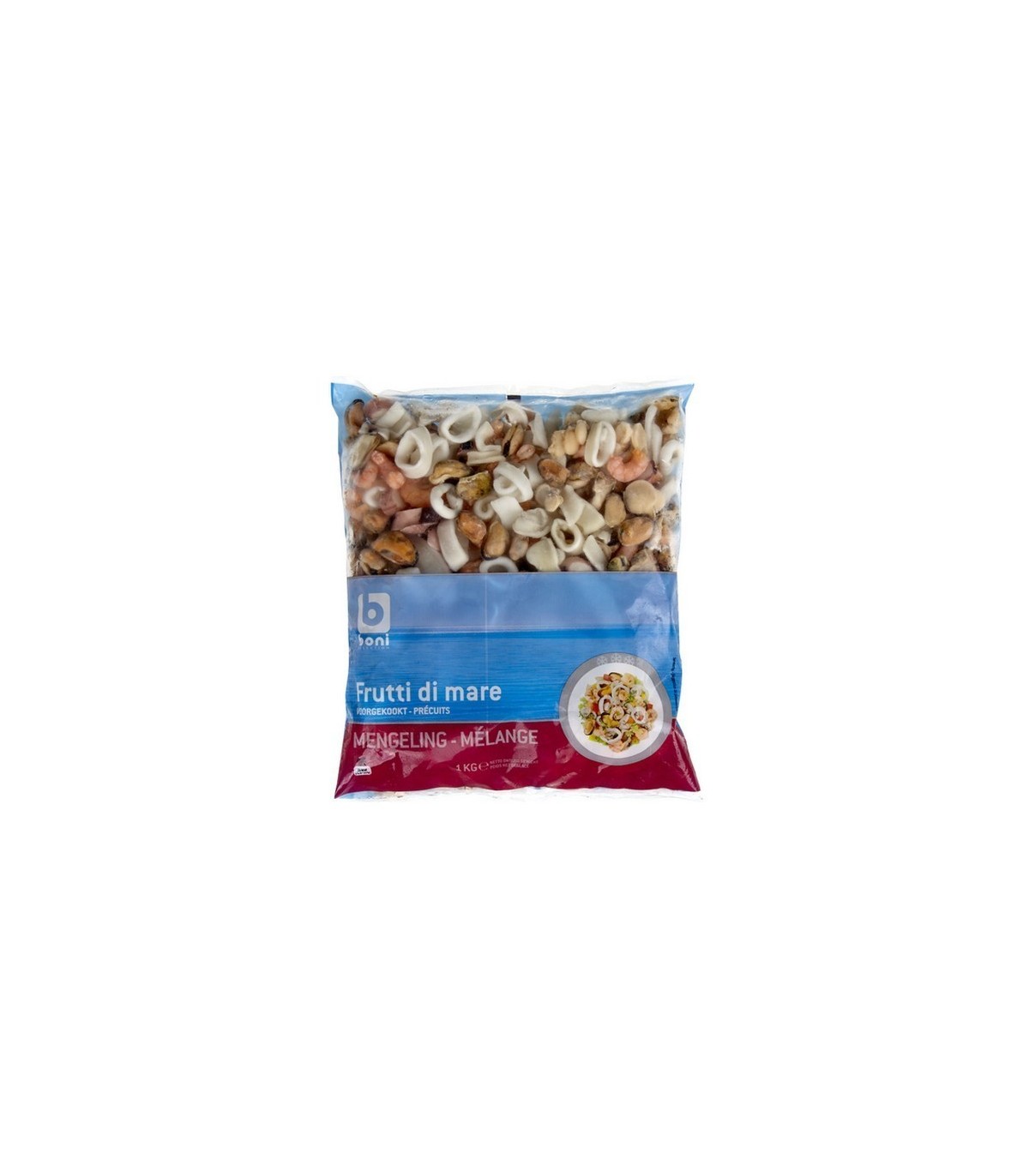 Boni Selection frutti di mare est un mélange de crustacés en proportion variable contenant des calmar, crevettes roses, moules, chair de coque, tentacules de calmar. Ce mélange est idéal pour vos préparation de paëlla maison, lasagne ou pâtes de fruits de mer et autres recettes à base de fruits de crustacés. Chaque paquet contient 1 kg.