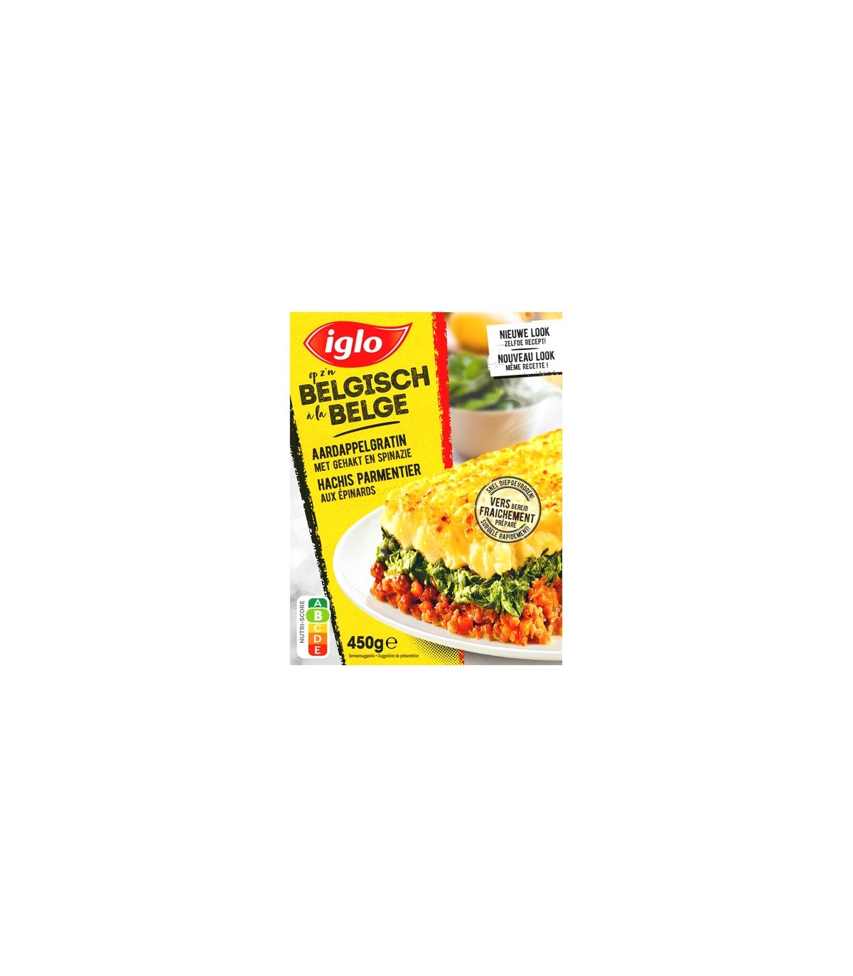 Iglo à la belge hachis parmentier aux épinards est un repas complet délicieux et rapide avec une couche de viande haché porc et boeuf, une couche d'épinard à la crème recouvert d'une généreuse couche de purée de pomme de terre. Chaque paquet contient 450 gr.