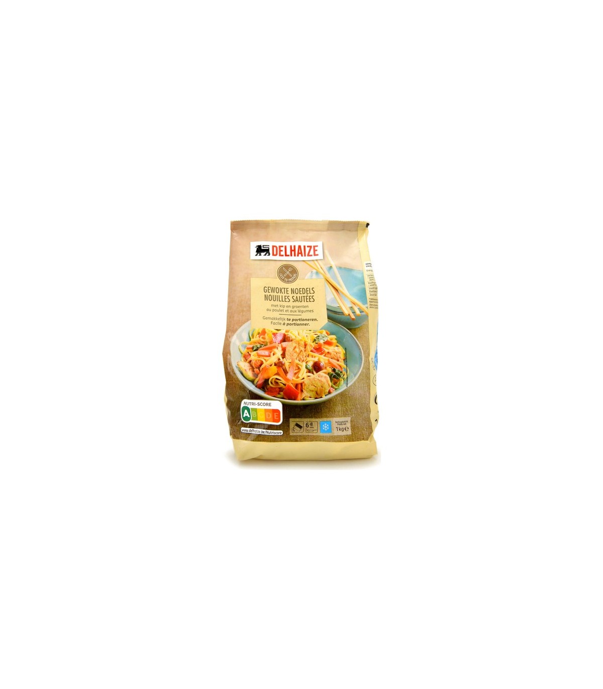 Delhaize nouilles orientales est un repas portionnable facile et rapide à réchauffer. Le plat se compose de nouilles au poulet avec des carottes, poivrons rouges et jaunes, paksoi, oignons, champignons et épices orientales. Chaque paquet contient 1 kg.
