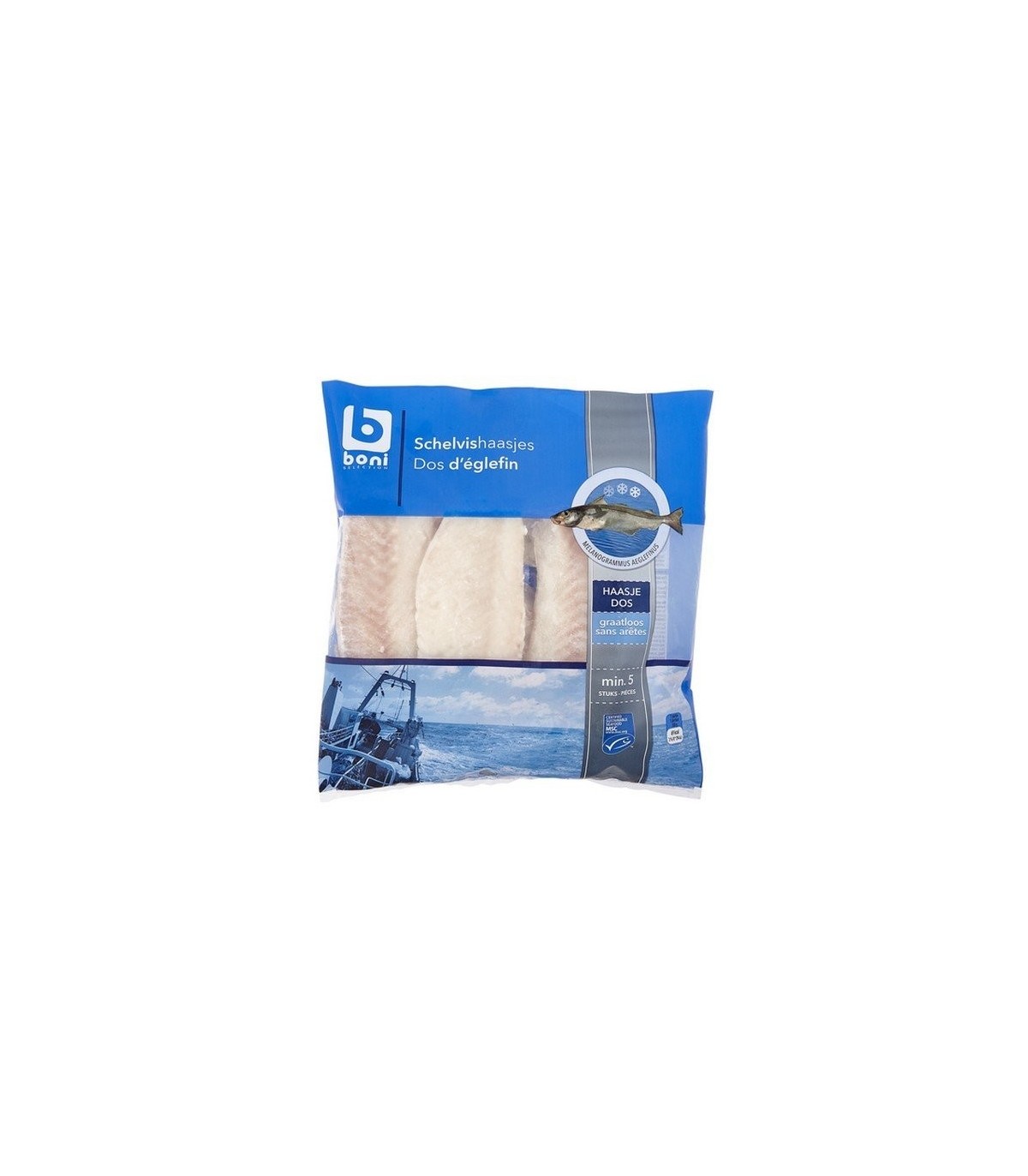 Boni selection dos d'églefin sans arêtes, le dos d'églefin est la partie la plus tendre de ce poisson. Manger du poisson 2 fois par semaine. Chaque paquet contient 5 à 6 pièces pour +- 1 kg.