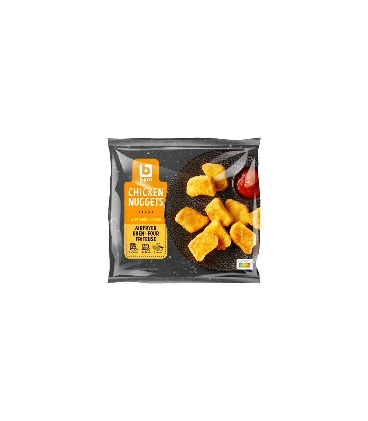 Savourez les nuggets de poulet Boni Selection, de délicieux morceaux de poulet enrobés d’une panure croustillante et dorée. Pratiques et rapides à préparer, ils sont parfaits pour un repas gourmand en famille ou un snack convivial. Grâce à leur polyvalence, vous pouvez les cuire facilement à l'air fryer, au four ou à la friteuse, selon vos préférences. Chaque paquet contient environ 24 nuggets, de quoi régaler petits et grands ! Idéals pour accompagner des sauces, des frites ou une salade, ces nuggets Boni Selection deviendront un incontournable de vos repas !