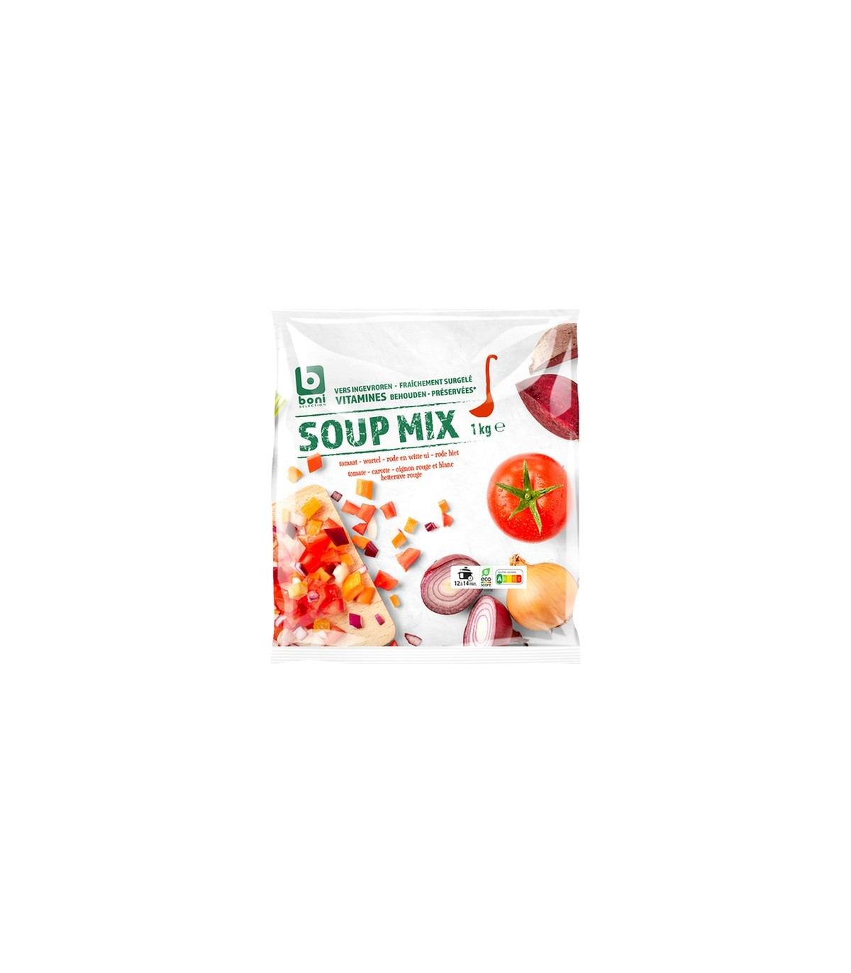 Boni Selection mélange pour potage rouge est un mélange de légumes : tomates, carottes, oignons rouges, oignons blancs, betteraves rouge. Quoi de mieux qu'un bon bol de soupe au repas. Chaque sachet contient 1 kg.